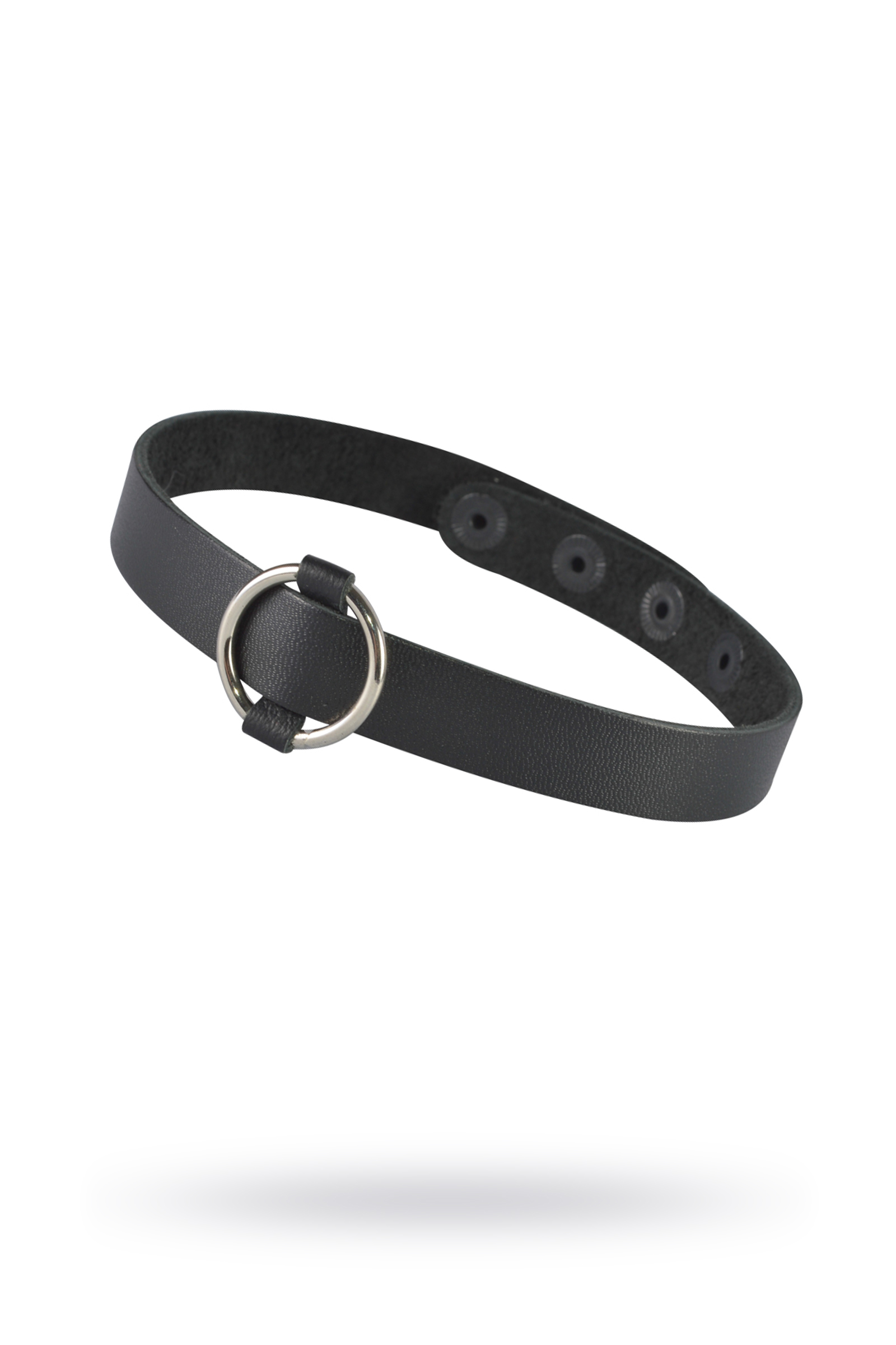 Чокер  из натуральной кожи черного цвета, декорирован  металлическим кольцом. Регулируется при помощи кнопок. Длина 40 см, ширина 1,5 см. Металлическое кольцо имеет никелевое покрытие.