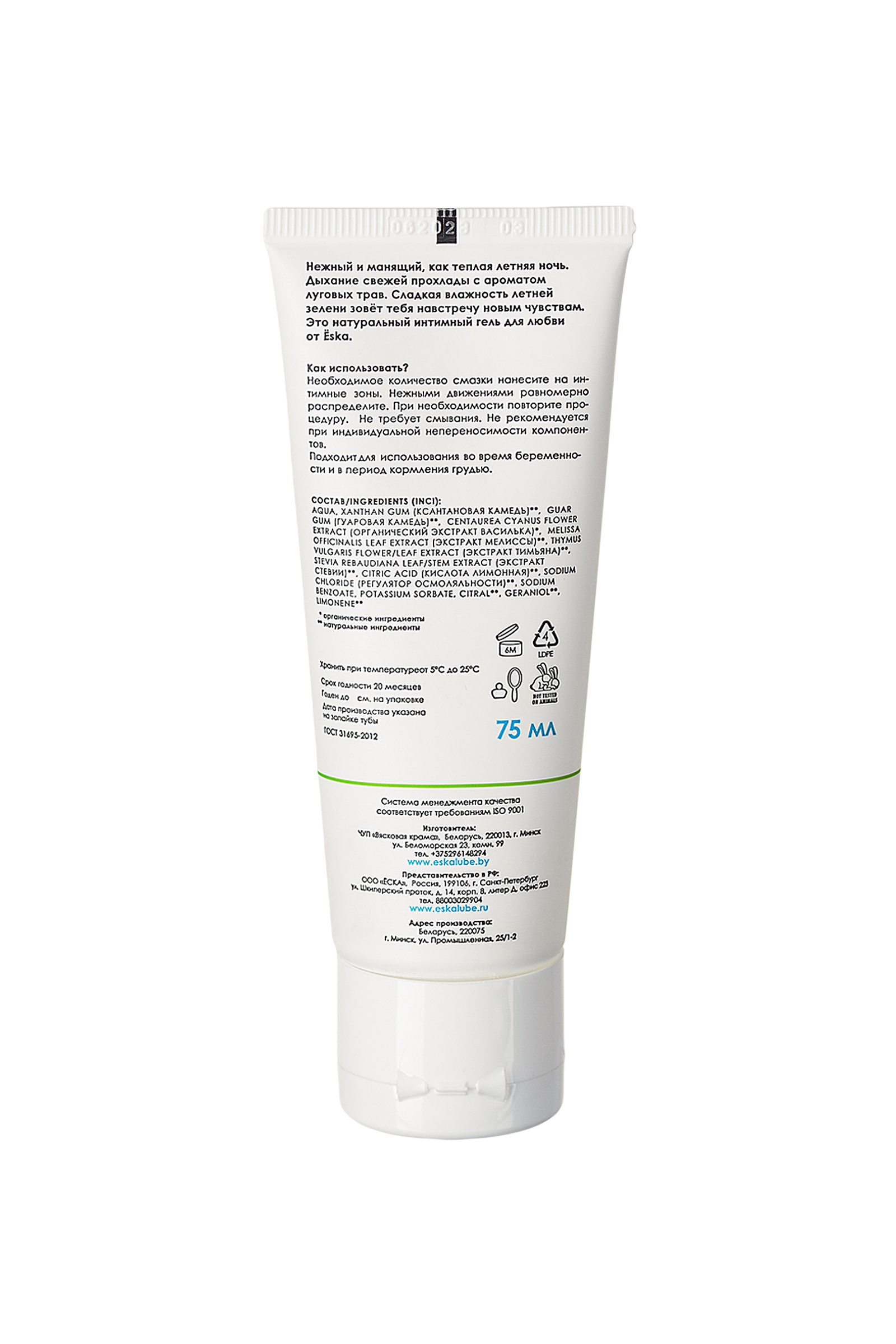 Попробуй вкус летней ночи с лубрикантом от бренда Ёска! Манящий и нежный, как теплая летняя ночь. Дыхание свежей прохлады с ароматом луговых трав. Сладкая влажность летней зелени зовет тебя на встречу новым чувствам. Это натуральный лубрикант для любви от Ёska. • 100% безопасная, чистая и натуральная формула. • Органический экстракт василька и мелиссы успокаивает, снимает сухость и раздражение. Обладает смягчающим и противовоспалительными свойствами. • Сладковато-лимонный аромат мелиссы пробуждает чувства. • Съедобная! • Стевия придает соблазнительную сладость. • VEGAN - формула не содержит ингредиентов животного происхождения или их производных. • Лёгкий гель имитирует естественную смазку женщины. • Не липкая, не оставляет следов, не требует смывания. • Гипоаллергенная. • Сбалансированный pH, 4,3. • Совместима с презервативами и секс-игрушками. • Универсальна для всех видов любви. Подходит для орального, вагинального и анального секса. Как использовать? Необходимое количество смазки нанесите на интимные зоны. Нежными движениями равномерно распределите. При необходимости повторите процедуру. Не требует смывания. Не рекомендуется при индивидуальной непереносимости компонентов. Подходит для использования во время беременности и в период кормления грудью. Состав Ёska Летняя ночь - лубрикант на водной основе: • Ксантановая камедь широко используется в пищевой продукции. Натуральный, безопасный, экологически чистый гелеобразователь. Не позволяет влаге испаряться. В смазке для получения прозрачной, шелковистой текстуры. Не раздражает даже чувствительную кожу. • Гуаровая камедь - натуральный загуститель, обладает увлажняющим и влагоудерживающим свойством. Получают камедь из семян растения гуар, известного также, как гороховое дерево. • Органический экстракт василька мягко действует на слизистую, успокаивает, снимает воспаление и раздражение. Наполняет сухую слизистую влагой. Дубильные вещества, содержащиеся в цветках, помогают бороться с инфекциями и бактериями. Подходит для чувствительной кожи. • Экстракт мелиссы успокаивает нежные ткани, отлично снимает зуд, раздражение и сухость. Оказывает противовоспалительное действие, заживляет и стимулирует кровообращение. Богат флавонойдами, которые обладают антиоксидантными свойствами. Придает смазке яркий травянисто-лимонный аромат, пробуждающий воспоминания о теплой летней ночи. • Экстракт тимьяна обладает выраженной противогрибковой и антимикробной активностью. Известен своим ранозаживляющим, противовоспалительным и антиоксидантным действием. Применяется в борьбе с вагинальными инфекциями. Оказывает местный обезболивающий эффект, снимает раздражение. • Экстракт стевии природный подсластитель. 0% калорий и 100% натуральный, абсолютно безопасный способ подсластить вашу жизнь. В отличии от сахара, стевия не является питательной средой для бактерий и грибков. Обладает противомикробным, ранозаживляющим и противовоспалительным действием. Она содержит в себе мощную комбинацию антиоксидантов, включая витамин С, витамин Е, флавоноиды, калий, кальций, железо, магний, цинк и фолат, которые благоприятно действуют на весь организм в целом. • Лимонная кислота помогает поддерживать оптимальный уровень рН, является естественным консервантом. • Хлорид натрия – регулятор