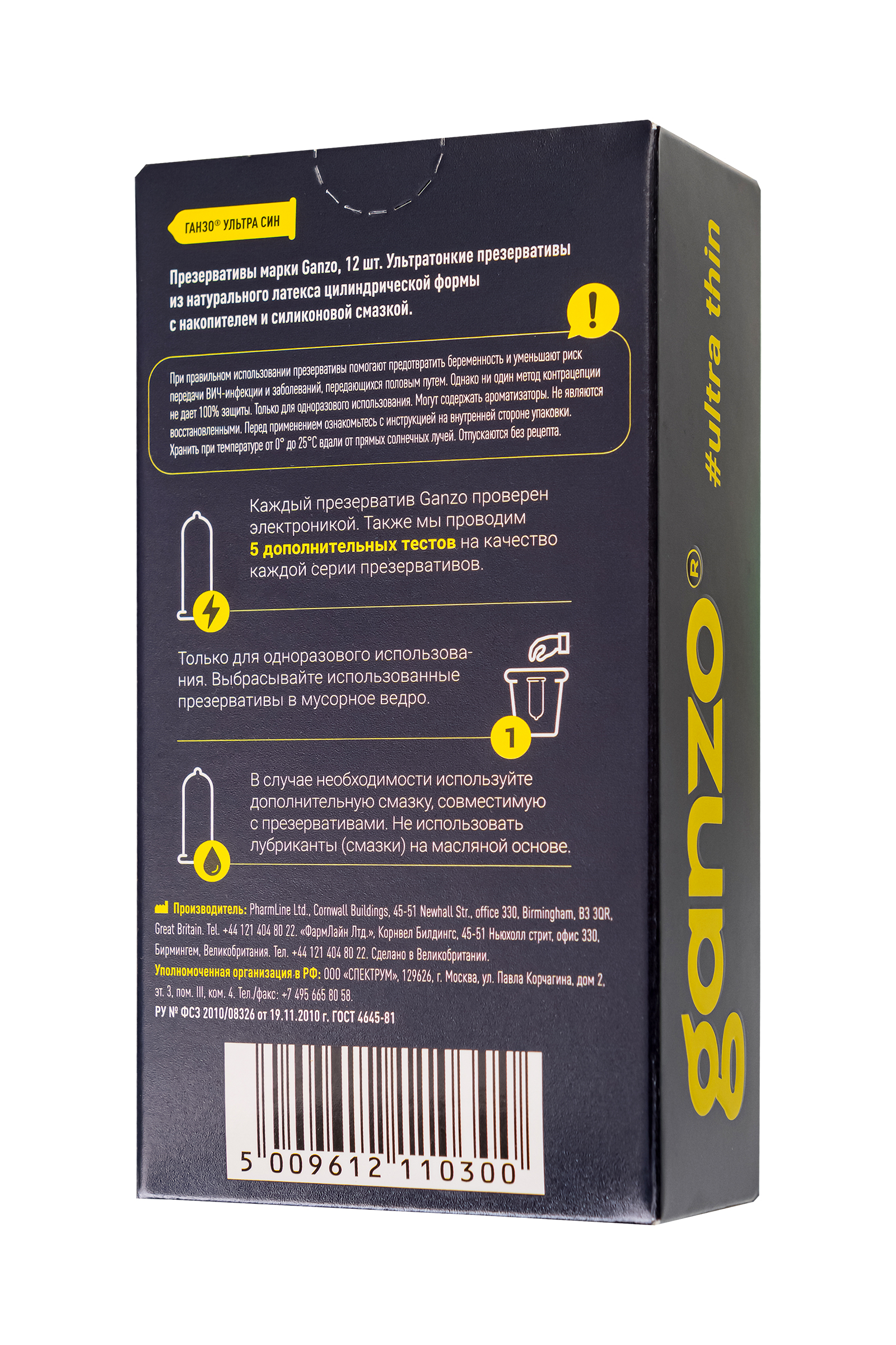 Ультратонкие презервативы Ganzo #ultra thin с накопителем в обильной смазке на водной основе. Презервативы сохранят естественность ощущений, не снижая уровня защиты. Не рекомендуется использовать ректально. Характеристики:  •  Материал презерватива: латекс.  •  Количество презервативов: 12, 3.  •  Длина презерватива: 18 см.  •  Ширина презерватива: 5,2 см.  •  Толщина стенки презерватива: 0,045 мм.  •  Производитель: Великобритания.